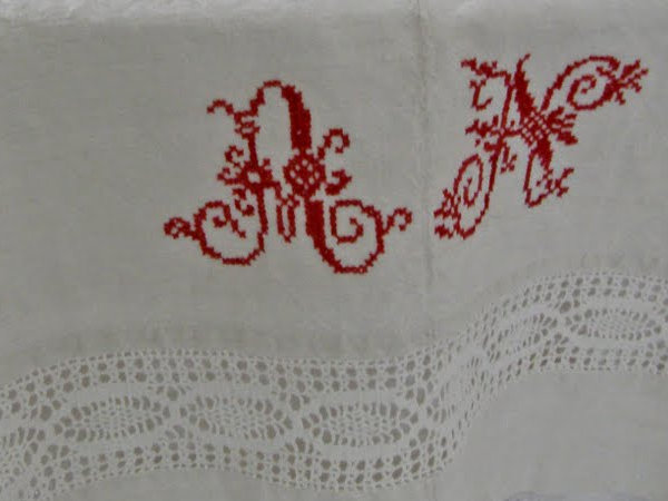 geborduurd monogram. Op een nieuw wit laken borduurde ik een monogram met antiek blauw DMC garen nr.931.